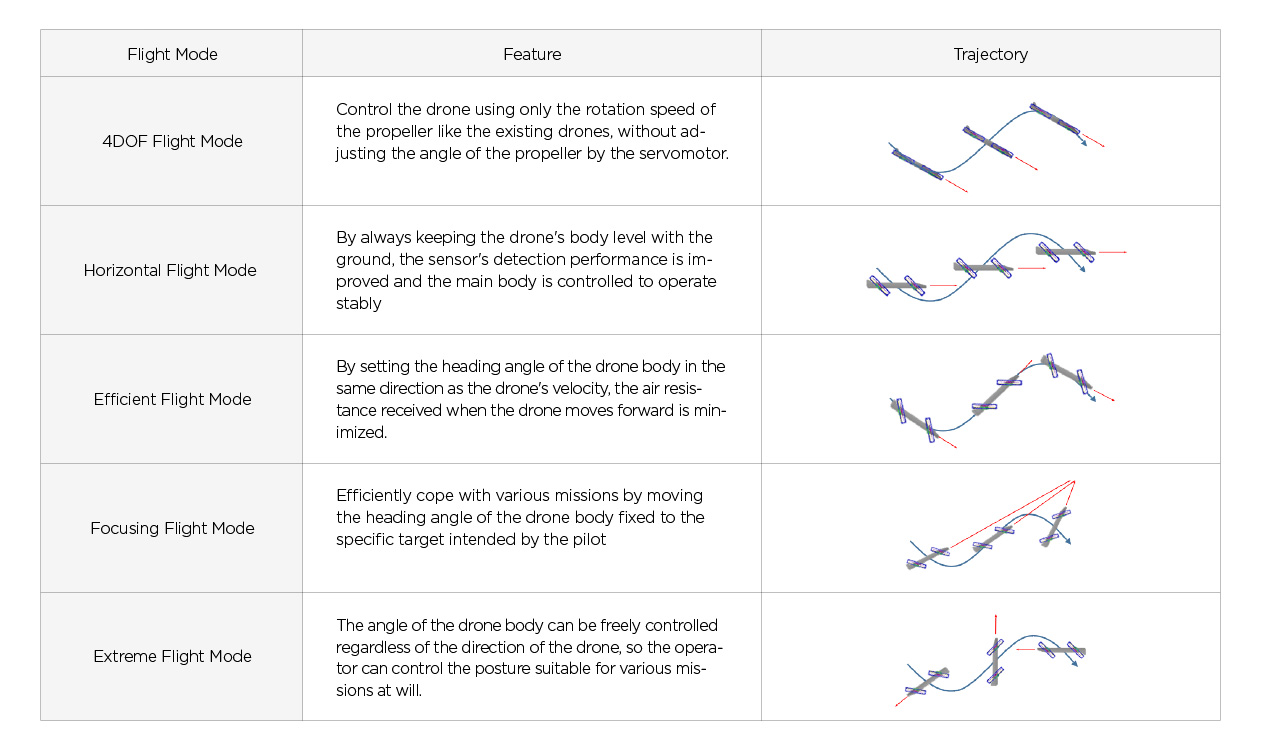 The angle of the drone body can be freely controlled regardless of the direction of the drone, so the operator can control the posture suitable for various missions at will.