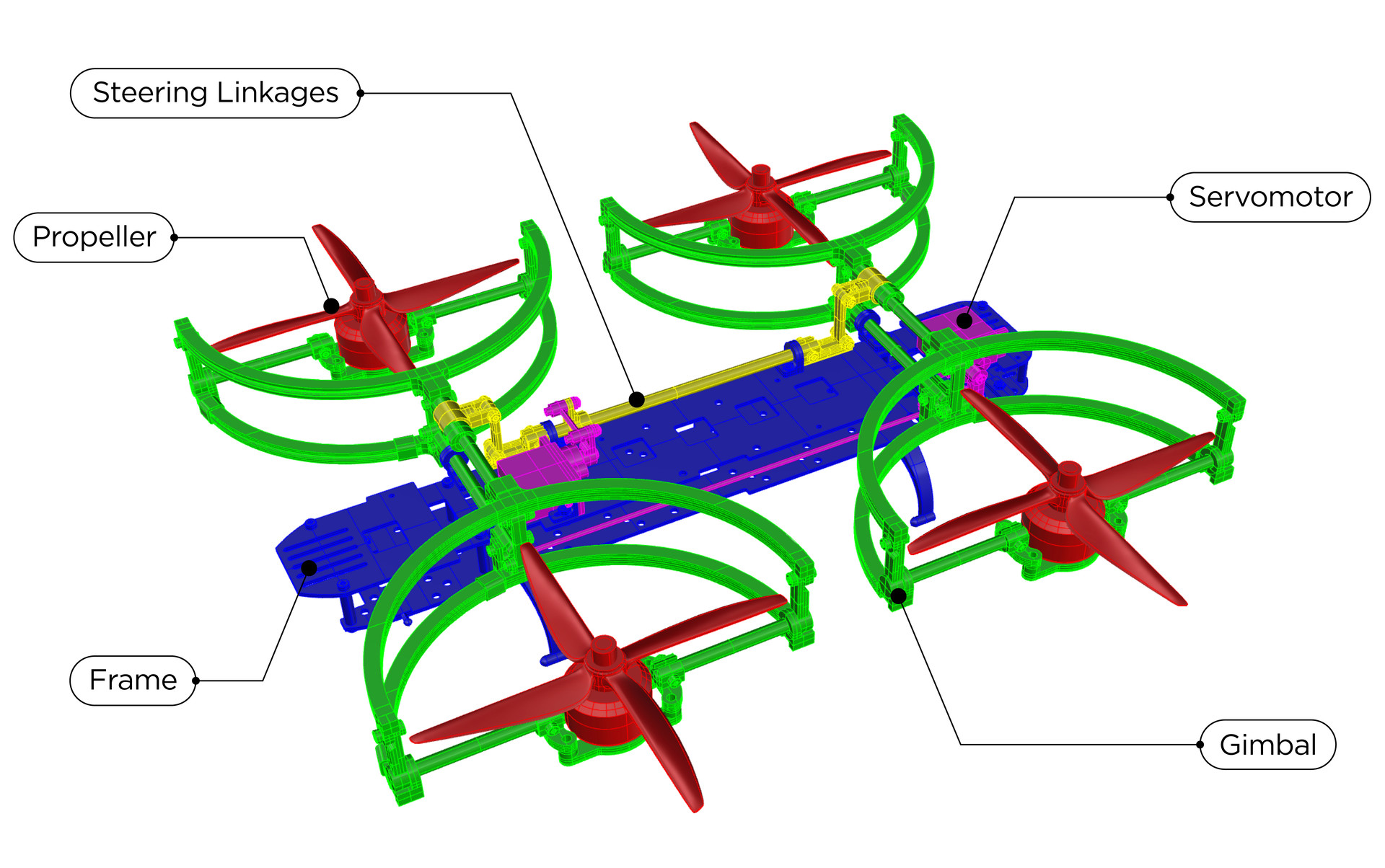 ● An aircraft consisting of a frame, 4 propellers mounted on a gimbal, 2 servomotors and steering linkages